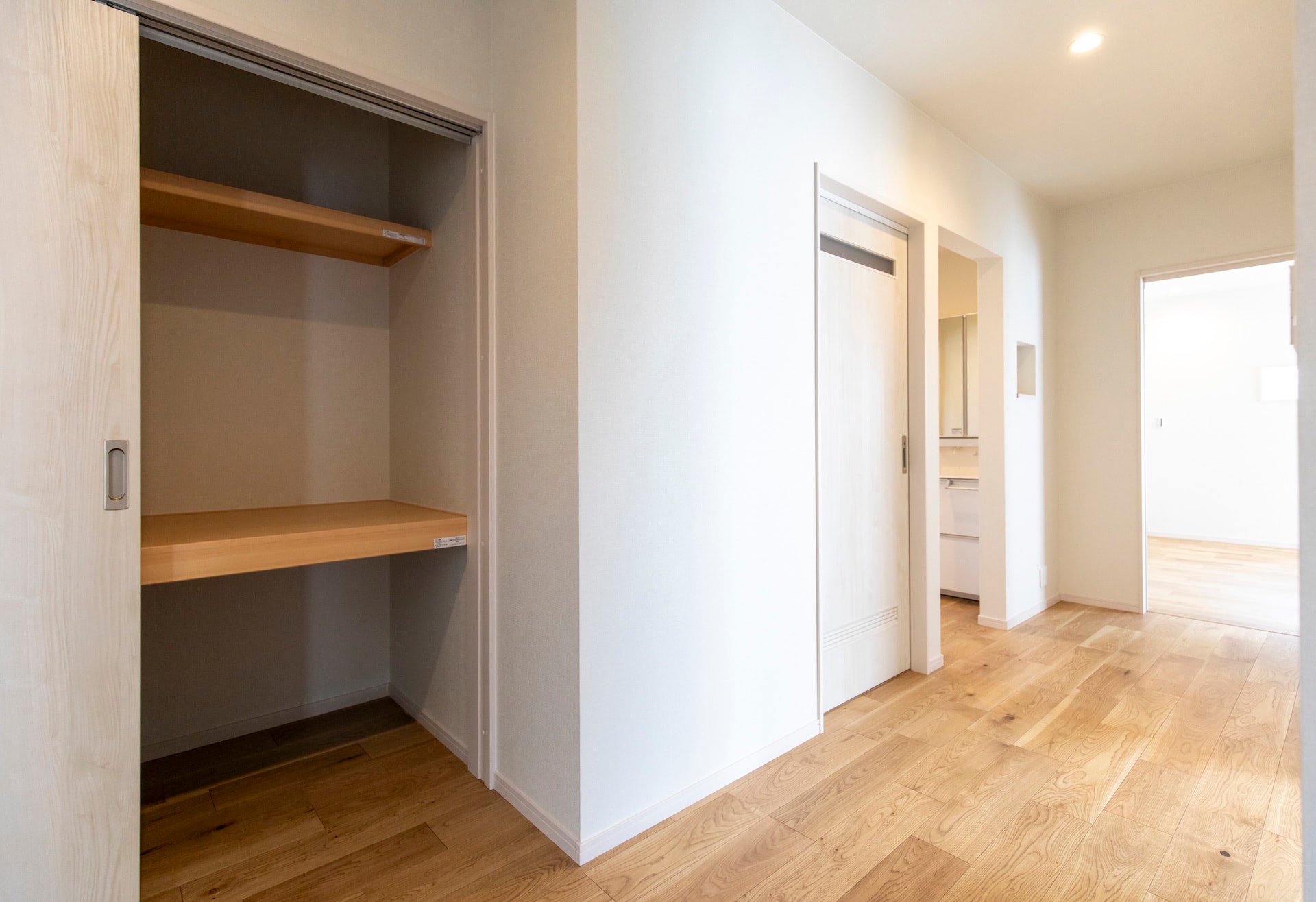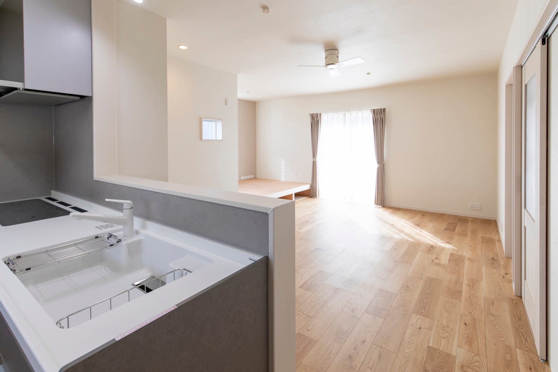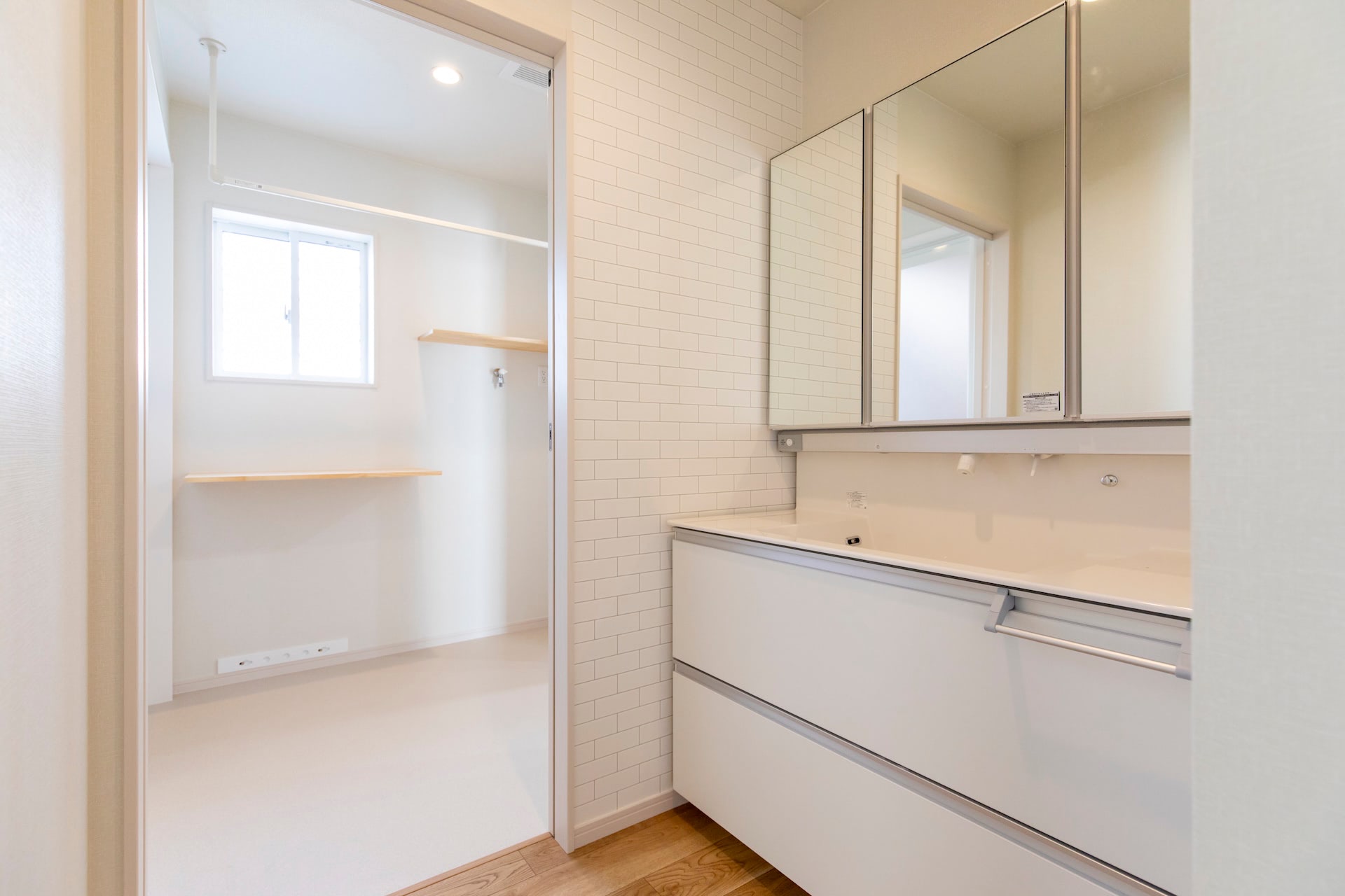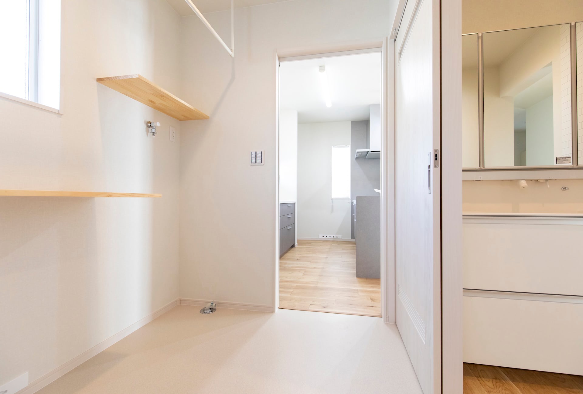 リビング~キッチン~ランドリールーム~浴室~洗面~とぐるりと回れ、生活動線もばっちりです。リビングの小上がりの畳スペースに設けられた大きな引き出しや廊下のニッチなど、収納にもこだわりました。