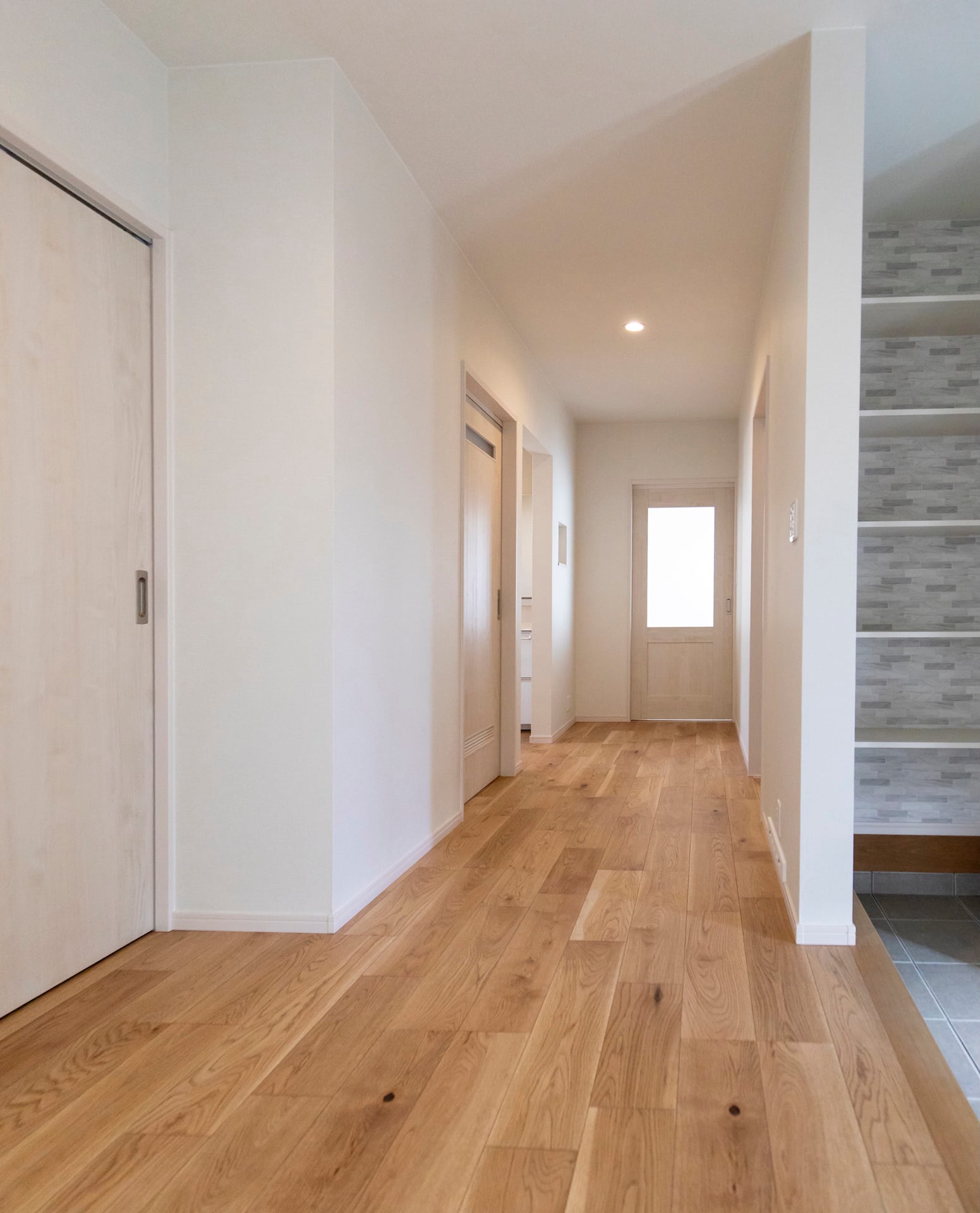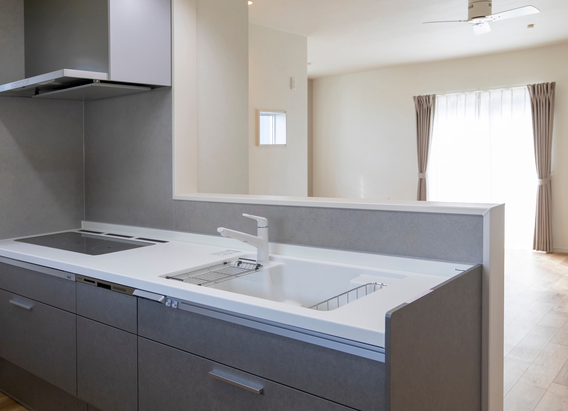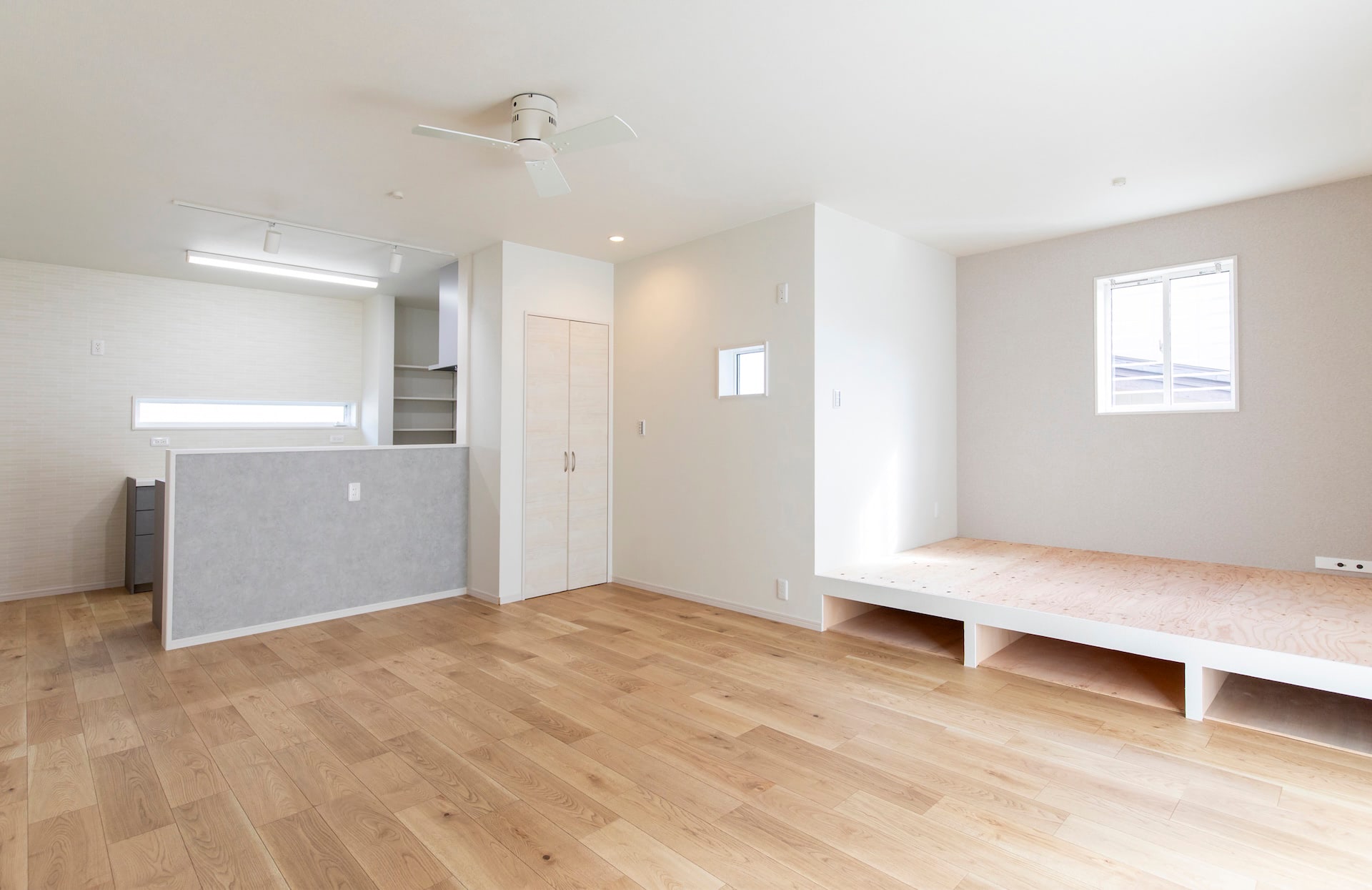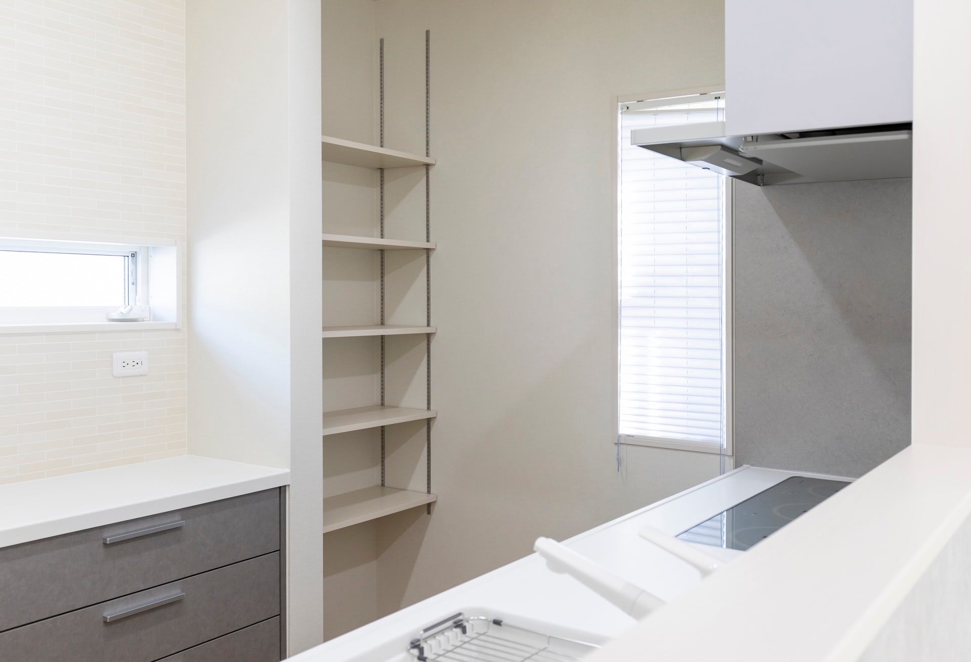 リビング~キッチン~ランドリールーム~浴室~洗面~とぐるりと回れ、生活動線もばっちりです。リビングの小上がりの畳スペースに設けられた大きな引き出しや廊下のニッチなど、収納にもこだわりました。