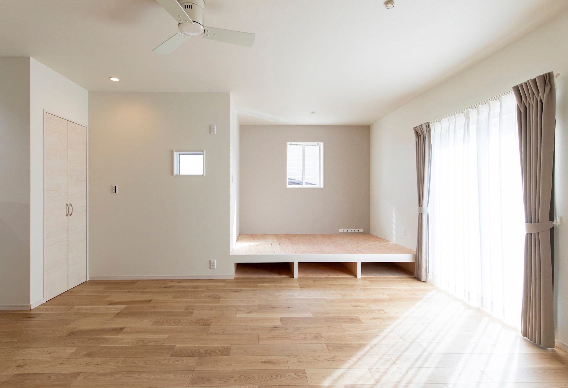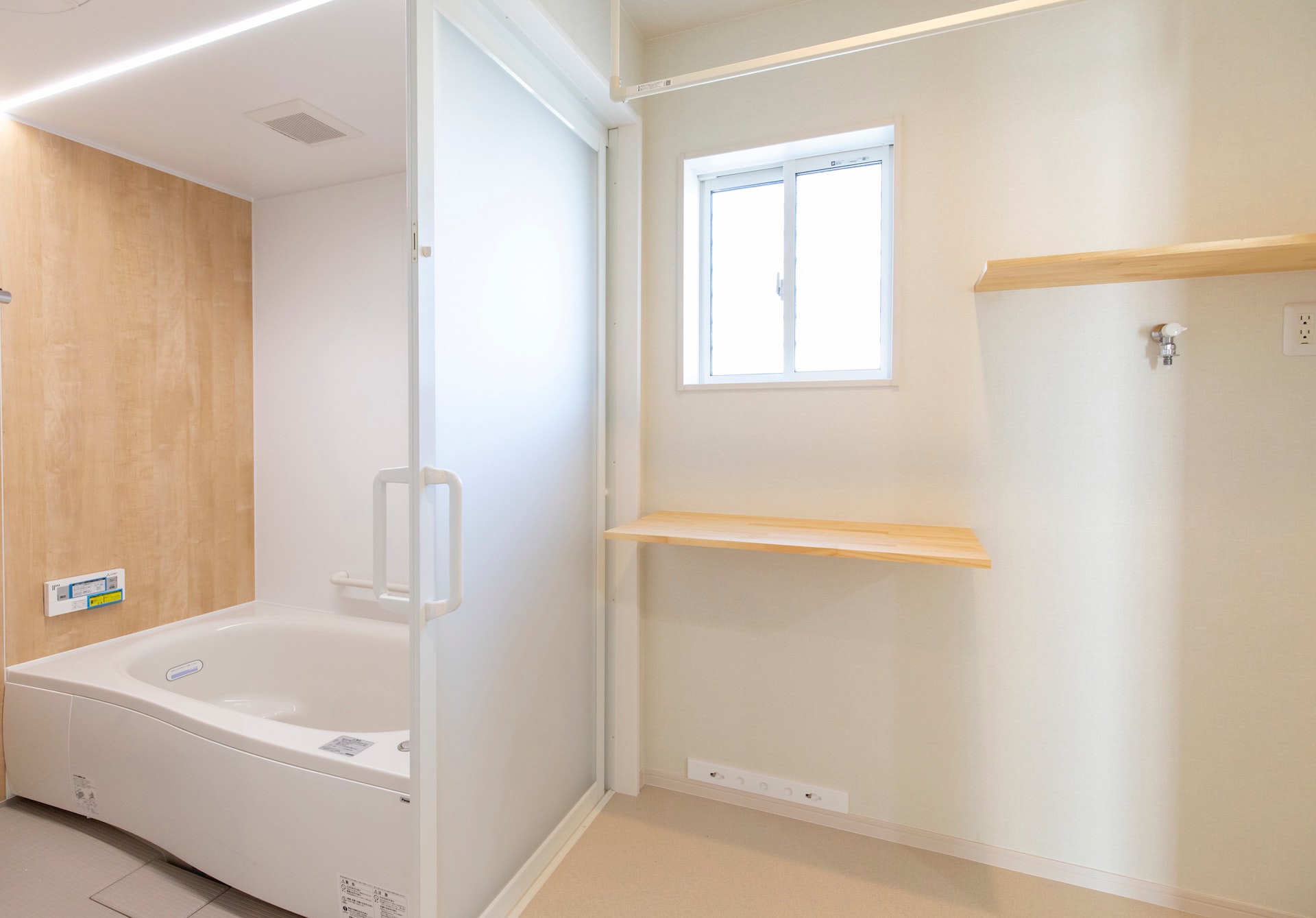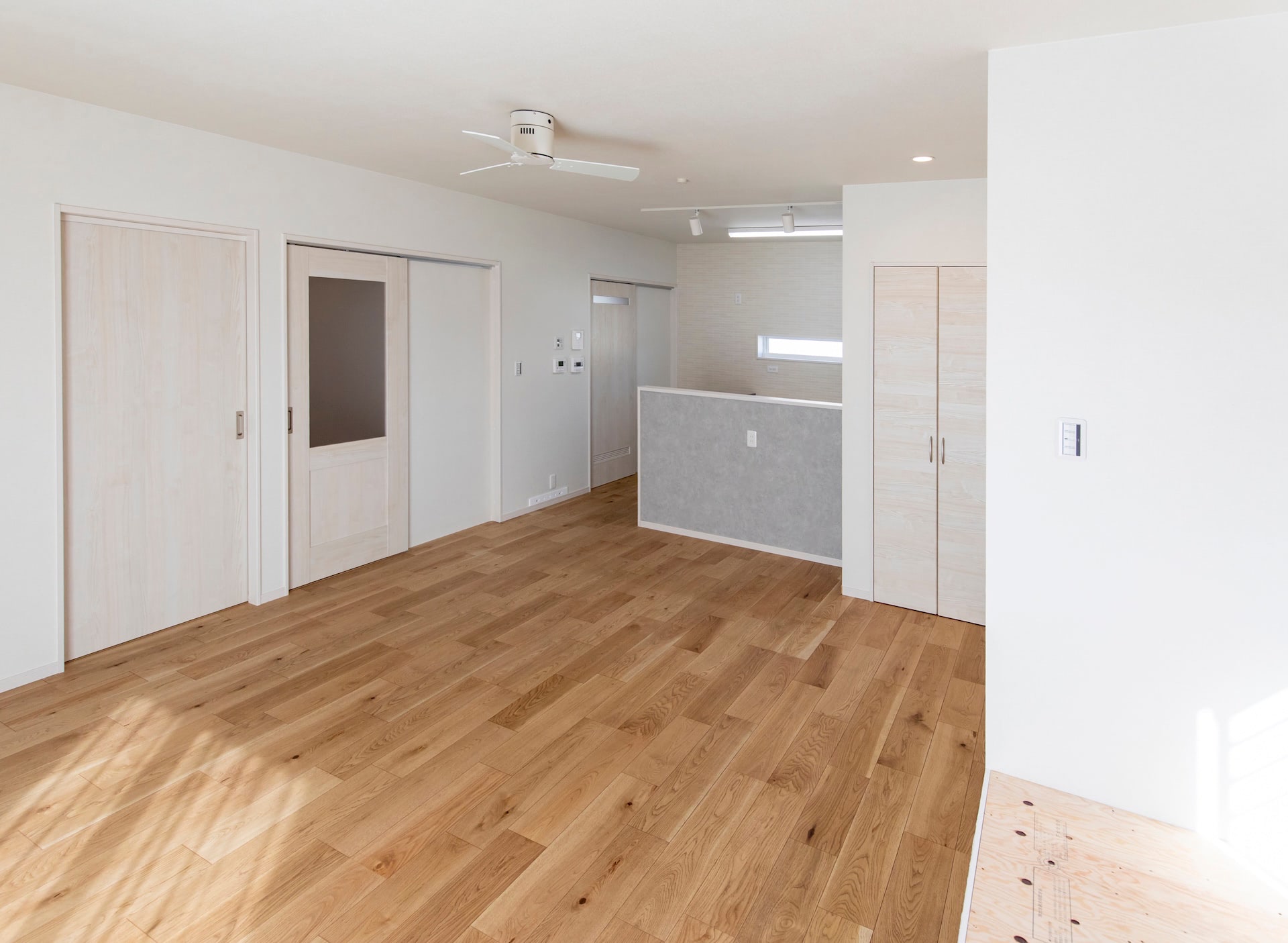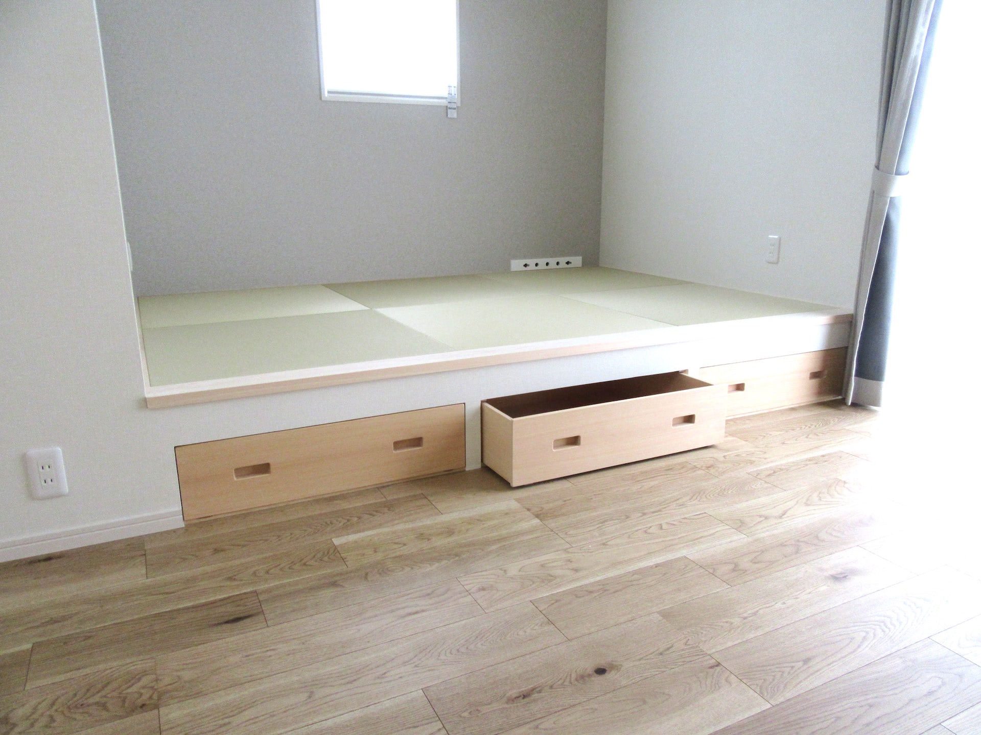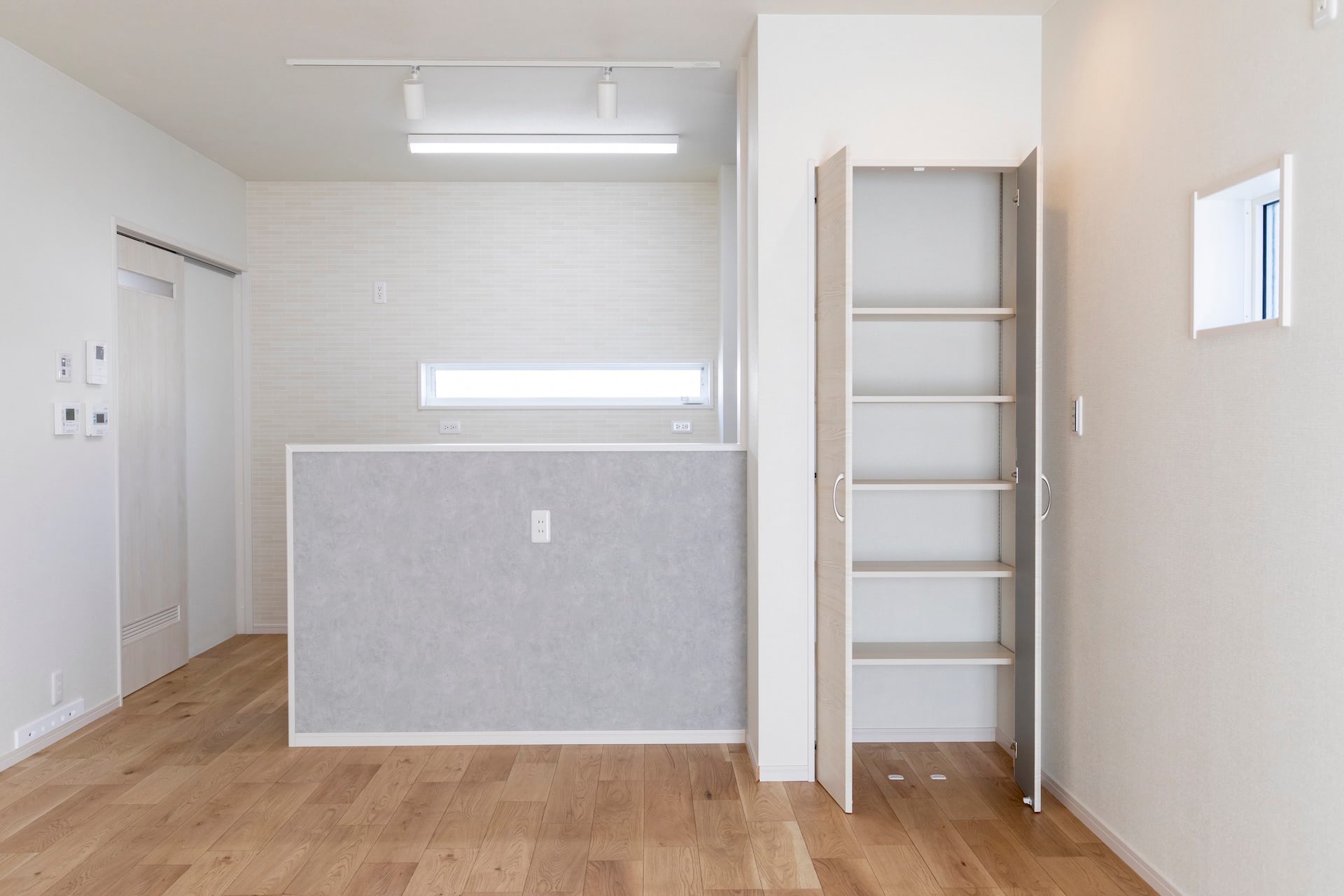 リビング~キッチン~ランドリールーム~浴室~洗面~とぐるりと回れ、生活動線もばっちりです。リビングの小上がりの畳スペースに設けられた大きな引き出しや廊下のニッチなど、収納にもこだわりました。